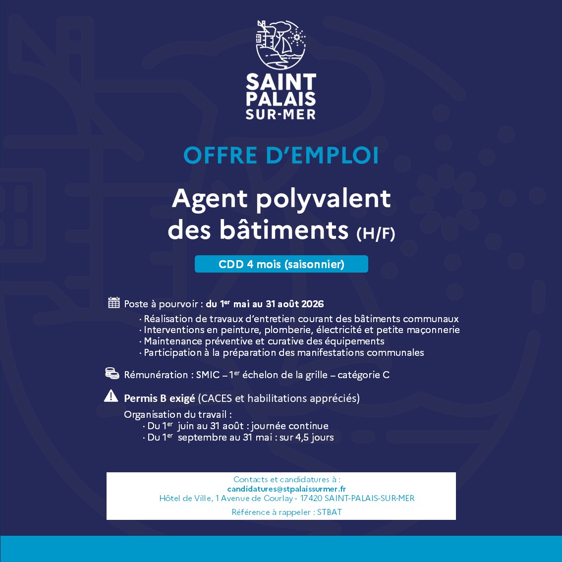 - Agent polyvalent bâtiments – CDD saisonnier de 4 mois.