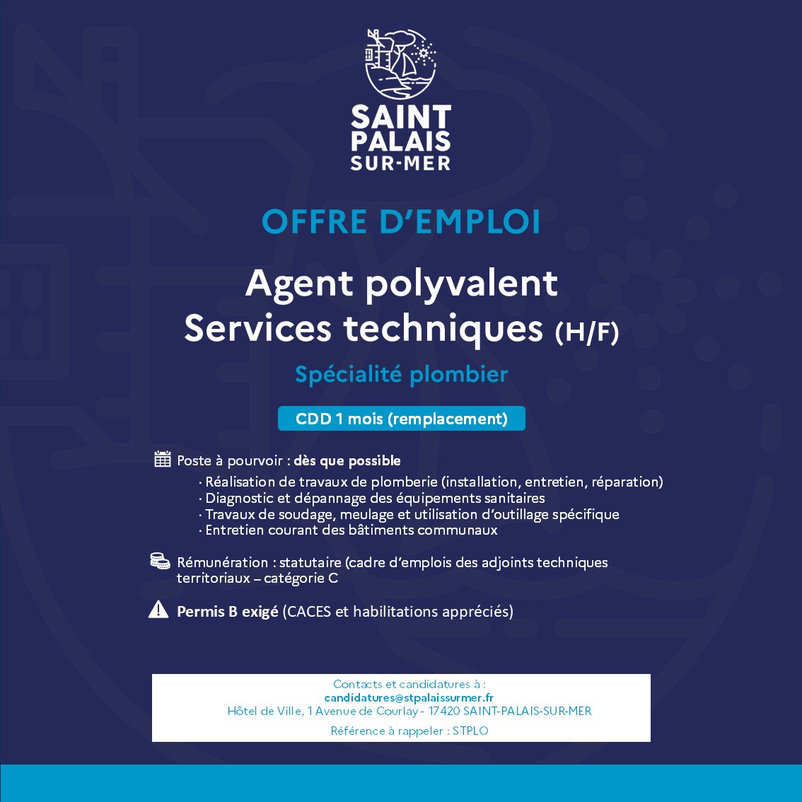 - Agent polyvalent en plomberie – CDD de remplacement d’1 mois, reconductible pendant la durée de l’absence ;