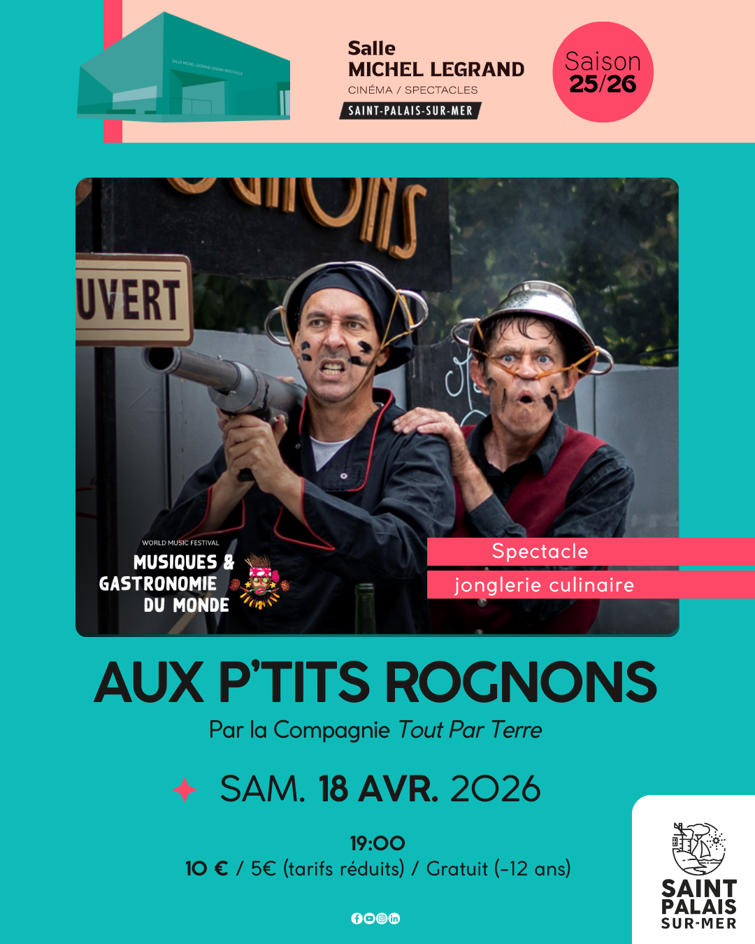 La Cie Tout Par Terre nous propose un spectacle de manipulation de condiments et ustensiles de cuisine, où une musique « aux p’tits ognons » rythme l’aventure des deux protagonistes. « Aux p’tits rognons » est un spectacle muet, où balles, louches, bouteilles et couverts voleront afin de proposer un service détonnant.